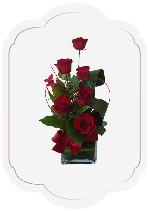 Diseño en seis rosas rojas y follaje. Diseño ideal para toda ocasión. Los complementos decorativos (mariposa), está sujeto a disponibilidad en la ciudad de entrega.