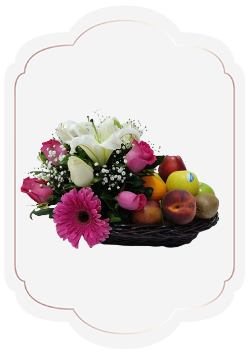 Diseño frutal y floral en cesta, ideal para manifestar sus sentimientos de felicitaciones en aquellos momentos especiales. Elaborado en cesta cuatro lirios blancos, cuatro rosas fucsia, dos rosas blancas y una gerbera, acompañados de ocho frutas (durazno, mandarina, manzana roja y verde, kiwi).